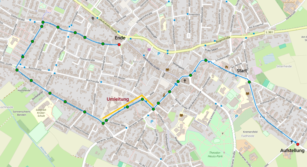 !!! Achtung – Aktuell kann es bezüglich der Sperrung auf der Viersener Straße zu einer Änderung des Zugweges kommen. Mögliche Alternative ist Hindenburgstraße –> Johannesstraße –> Süchtelner Straße